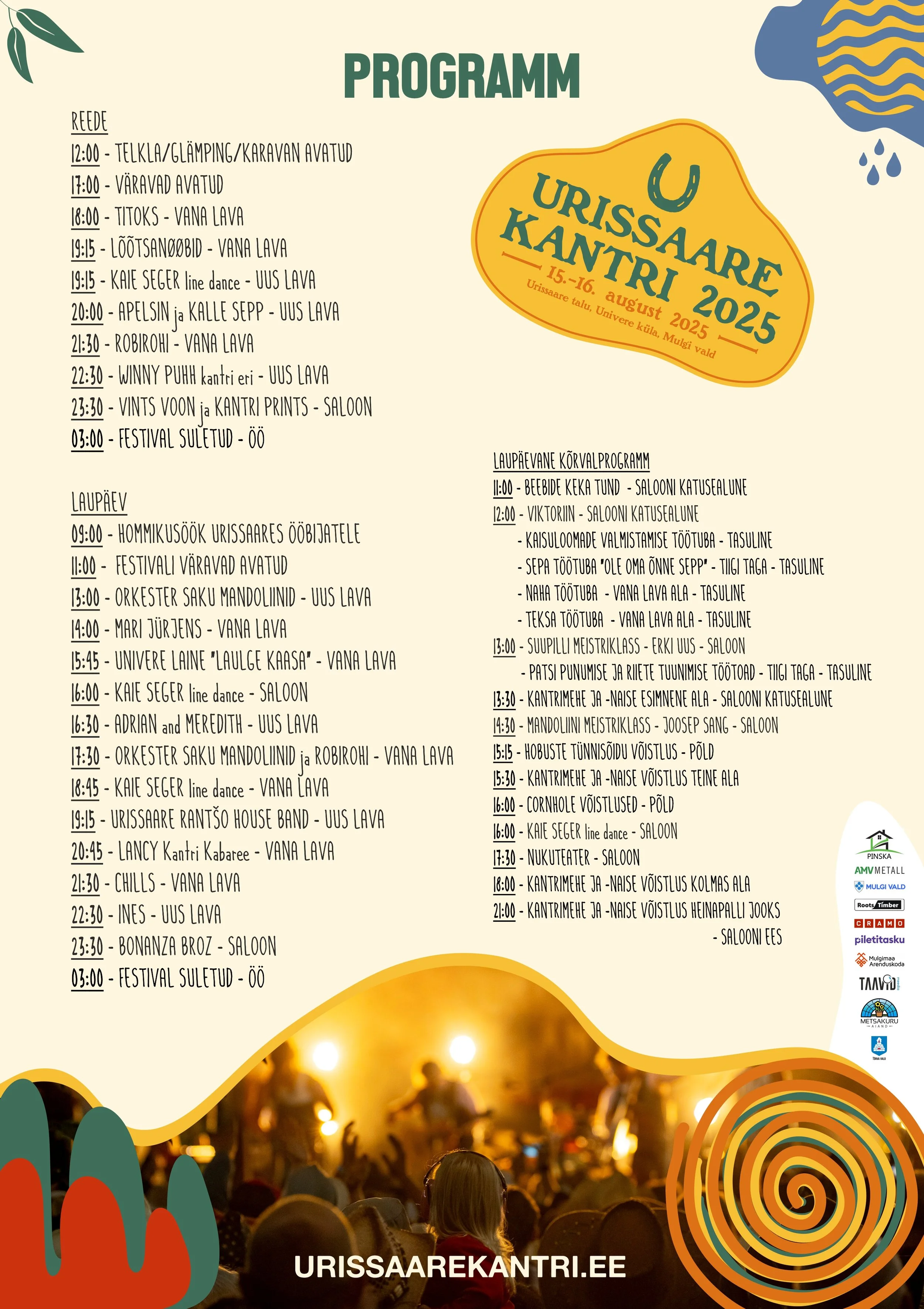 Ootame teid 14.-15. augustil 2026 Urissaare Rantšosse, Univere külas, Mulgimaal. Kahepäevasel festivalil ootab teid meeleolukas muusikaprogramm – mitmel laval on andekad artistid Eestist ja välismaalt. Lisaks põnevad töötoad, line-tantsu meistriklass, taluhoovi restoranid, ehedad maitsed, valgusinstallatsioon ning kantridisko hommikuni!